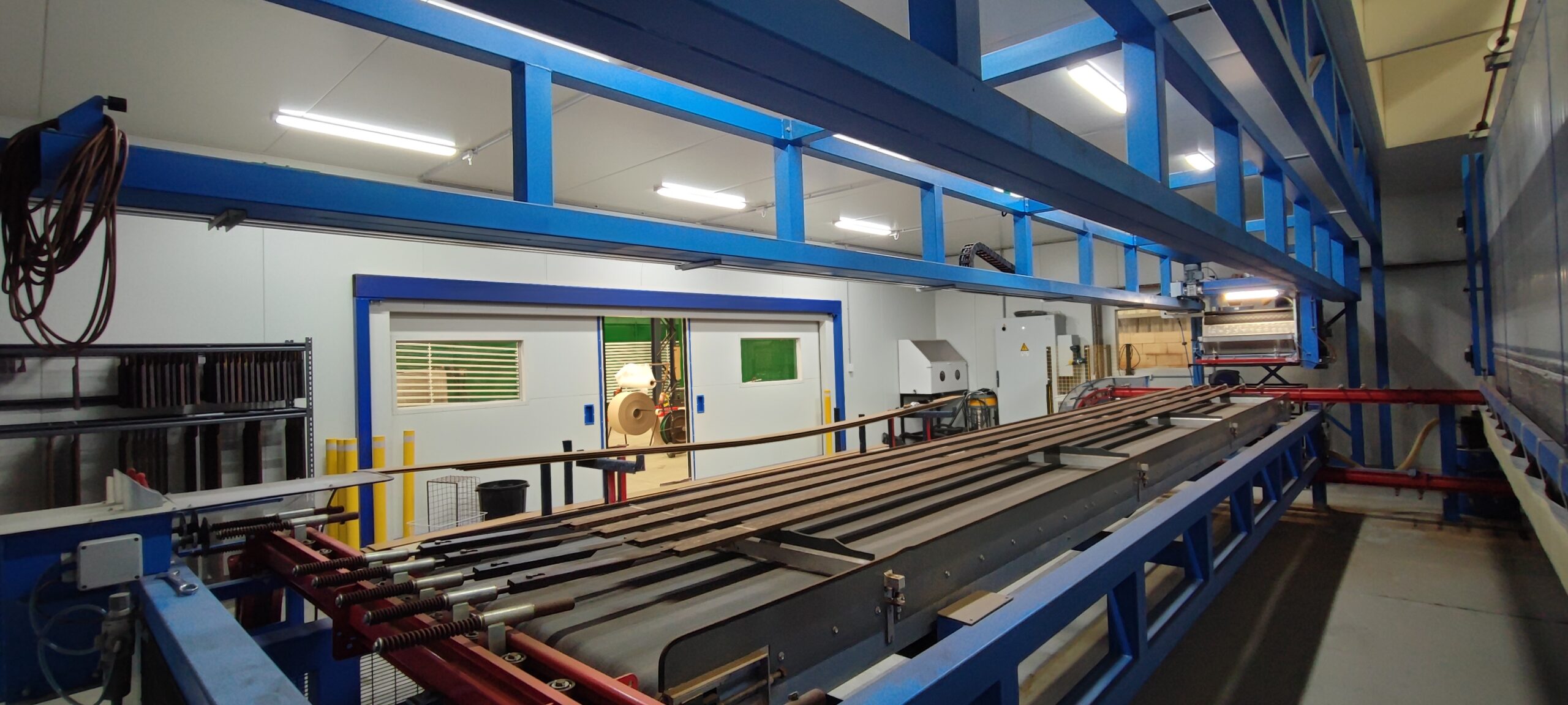 Terminata la fase di verniciatura i profili transitano all'interno del forno di polimerizzazione per la cottura finale ad aria calda a 180° per 20 minuti.